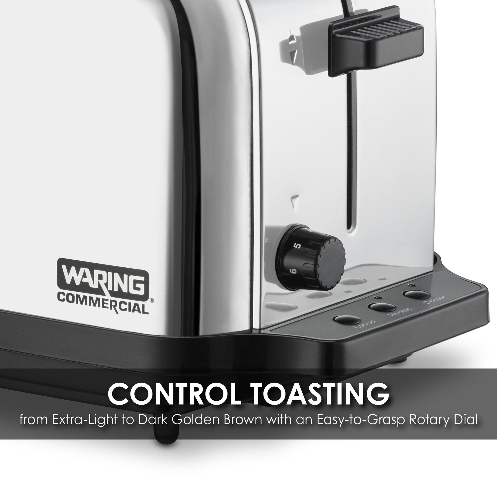 Get reliable performance and a contemporary look with the Waring® WCT702 Light-Duty 2-Slot Toaster. Defrost and toast frozen bread with the touch of a button. Easily remove smaller foods like English muffins with the extra-high lift control. Adjust browning from extra light to dark golden brown with the rotary dial. The pull-out crumb tray slides out for easy cleaning.
