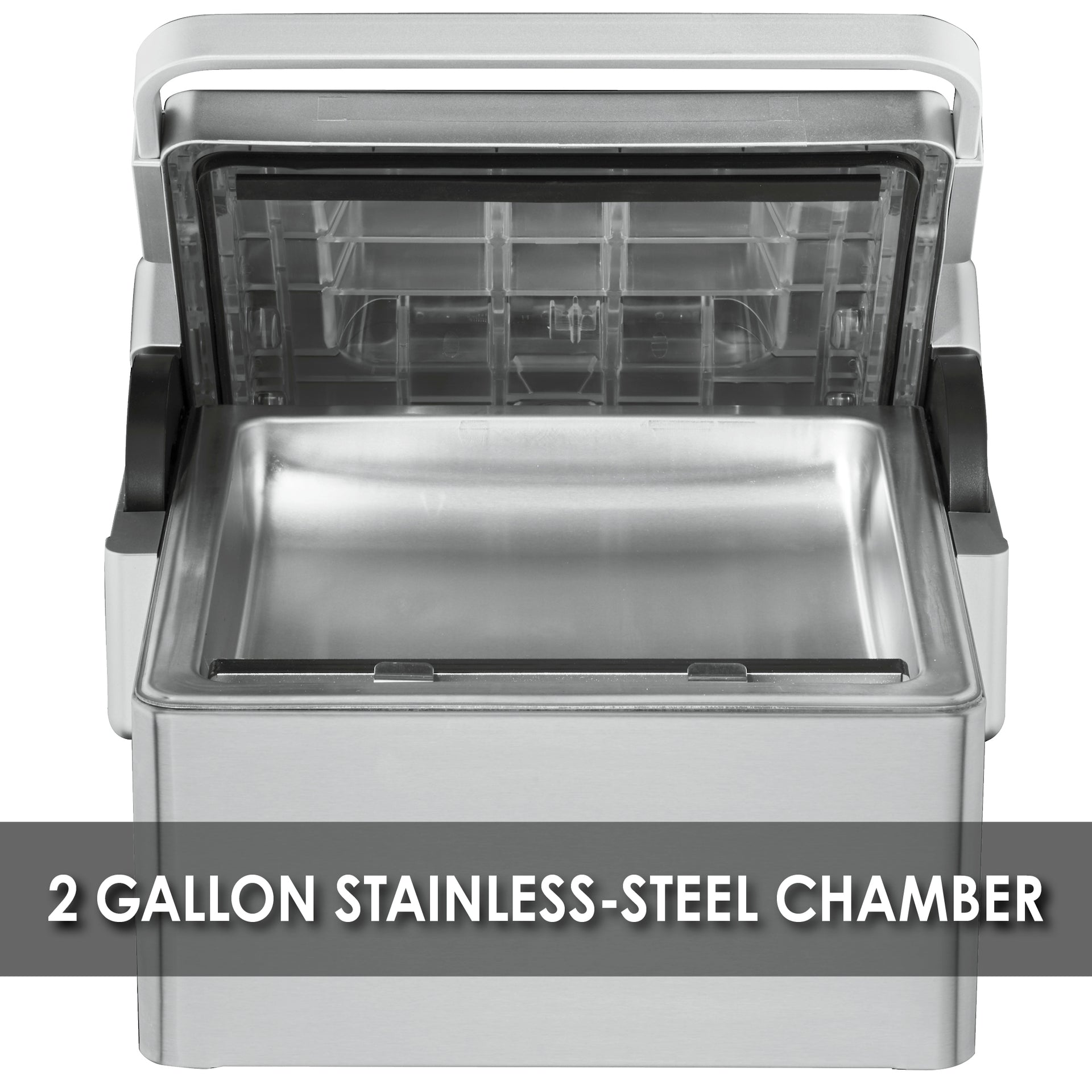 - Stainless steel 2-gallon chamber with see-through lid and ergonomic handle