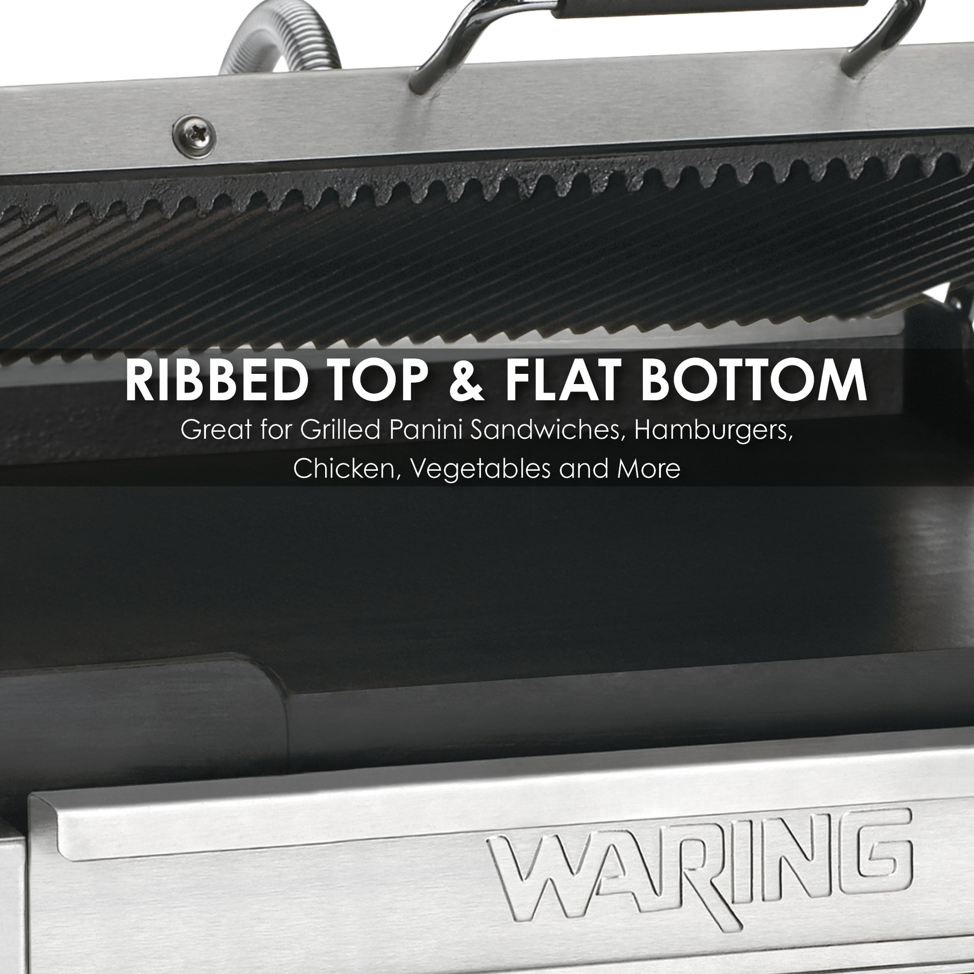 Make perfectly grilled panini sandwiches and more with the 120V Waring® WDG250 Large Italian-Style Panini Grill. Grooved, top cast-iron plate and flat cast-iron plate on the bottom heat evenly and quickly to cook sandwiches, burgers, chicken, and vegetables up to 3" thick. Its brushed stainless steel body and removable drip tray are easy to clean. Includes POWER and READY indicator lights.
