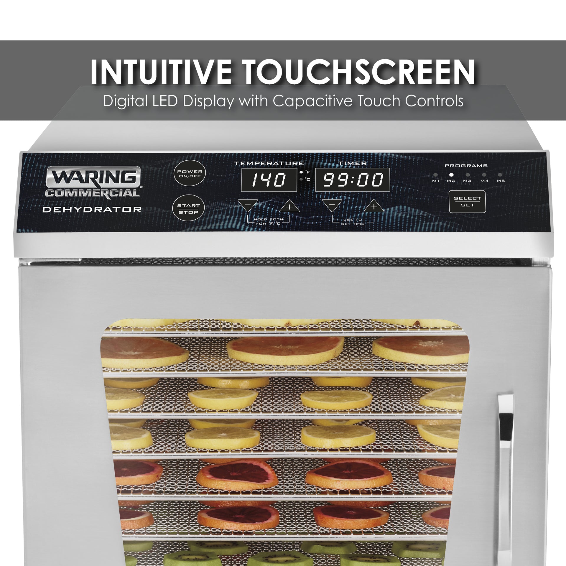 Dried foods can add unique flavors and textures to drinks, meals and desserts, and with the Waring® WDH10, a business can prepare its own. The 10-tray dehydrator makes delicious jerky, dried fruits, herbs, vegetables and more. Accommodates large batches without taking up much counter space. Engineered to concentrate flavor and preserve freshness, with intuitive touchscreen controls that make the dehydrating process simple.