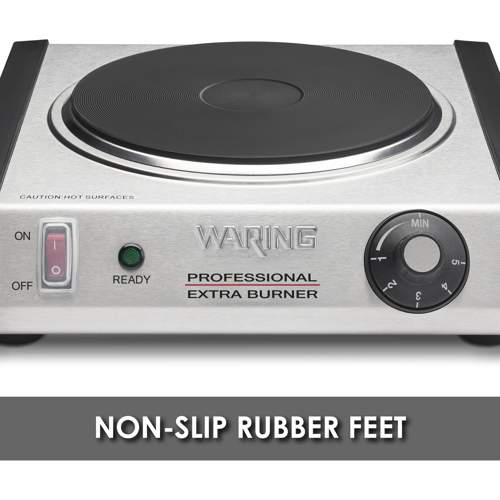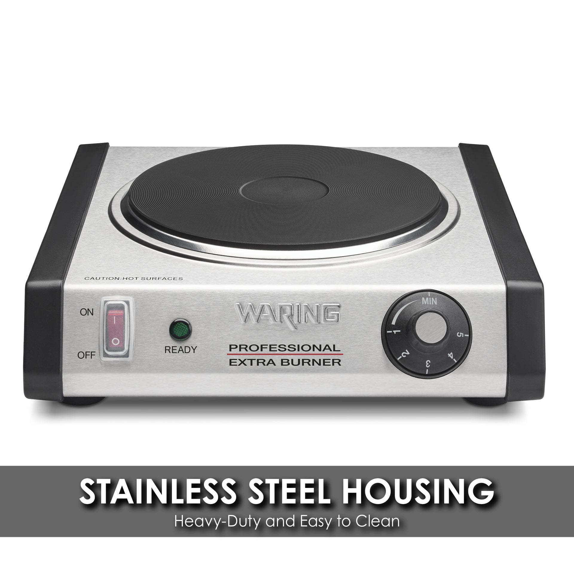 The Waring® WEB300 Commercial Cast-Iron Single Burner offers a heavy-duty, portable solution for your omelette, catering or buffet stations. A 1300 watt heating element heats up the 7" cast-iron burner plate quickly and evenly. Non-slip rubber feet keep the burner stable, while the adjustable thermostat with ON and READY indicator lights alert you when it reaches the desired temperature.