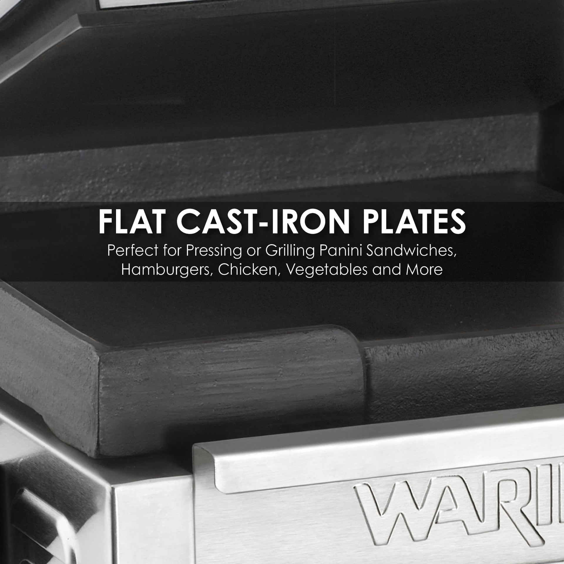 Make all of your signature sandwiches and more with the 120V Waring® WFG150 Compact Italian-Style Flat Grill. Flat cast-iron plates heat evenly and quickly cook sandwiches, burgers, chicken, and vegetables up to 3" thick. The brushed stainless steel body and removable drip tray are easy to clean. Includes adjustable thermostat to 570°F plus POWER and READY indicator lights.