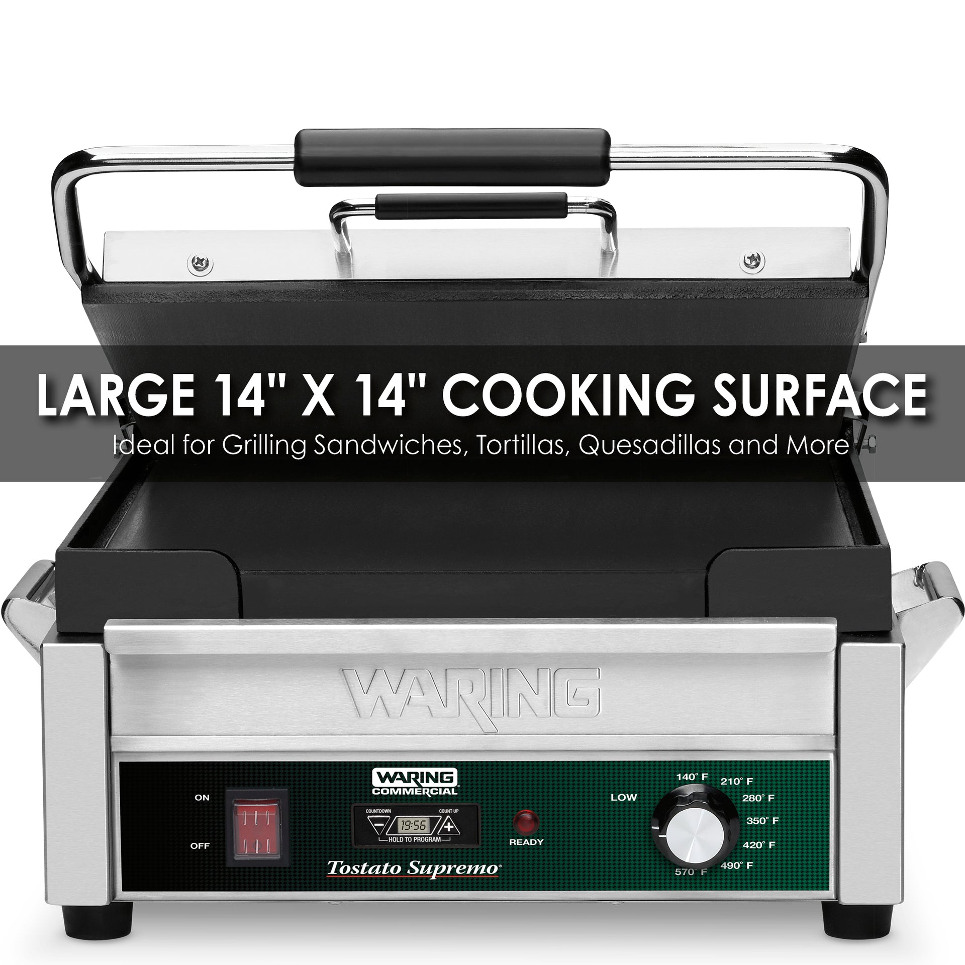 Make delicious quesadillas, tortillas, paninis and more and more with the 120V Waring® WFG275T Full Size 14" x 14" Flat Toasting Grill. Flat cast-iron plates heat evenly and quickly cook sandwiches, burgers, chicken and vegetables up to 3" thick. Its brushed stainless steel body and removable drip tray are easy to clean. Includes power ON and READY indicator lights, and timer.