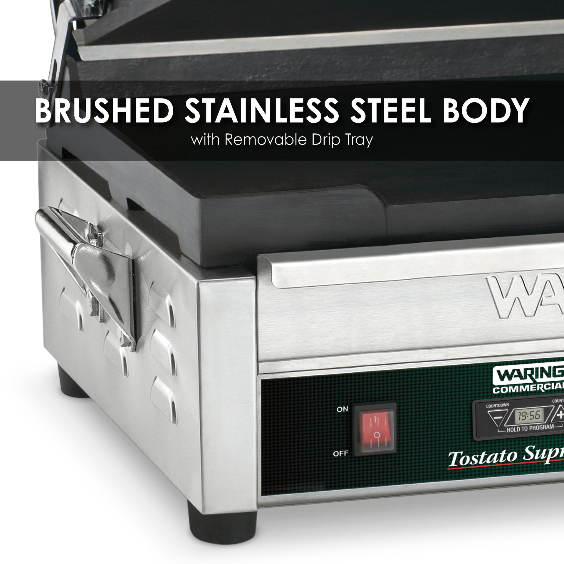 - Brushed stainless steel body and removable drip tray