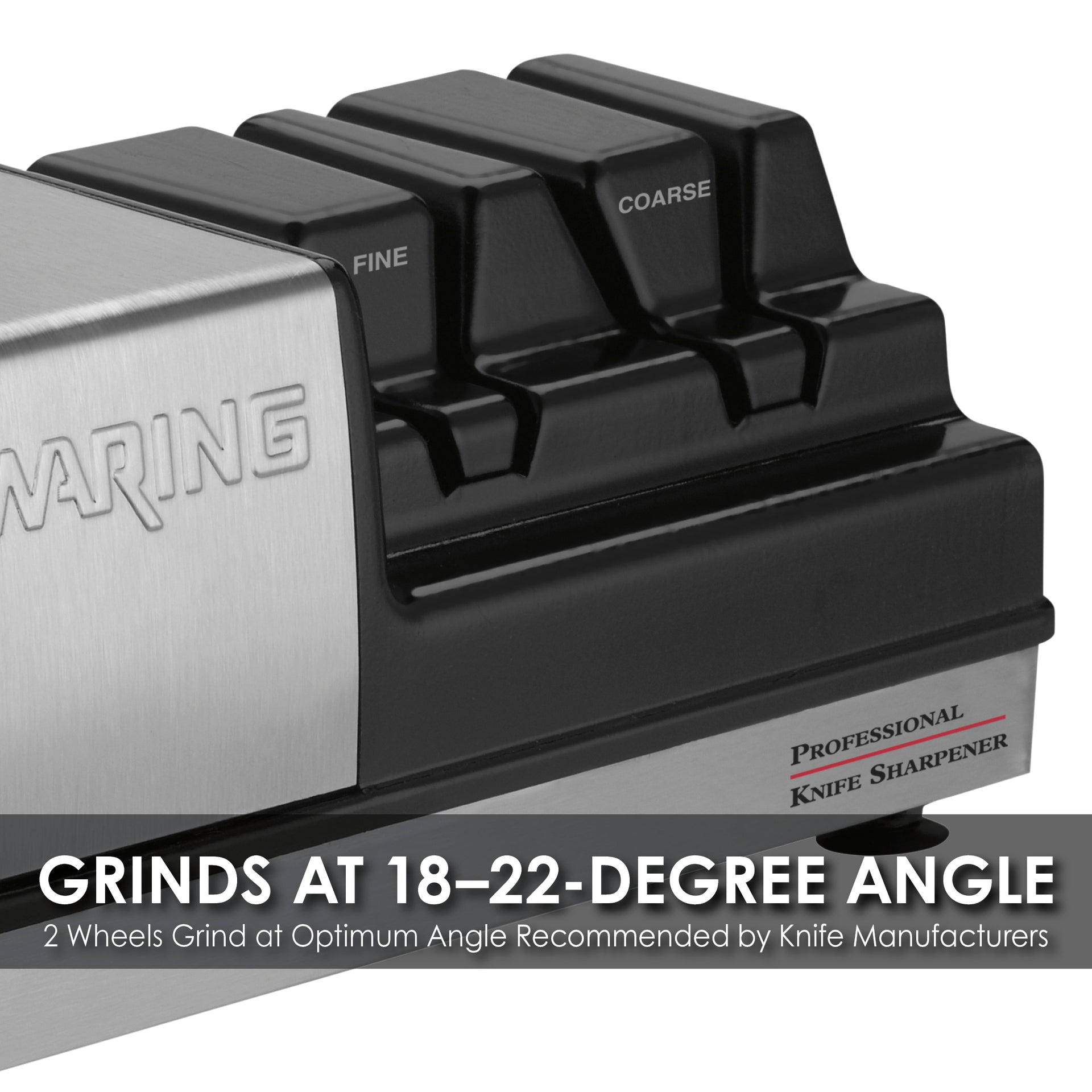 Maintain your kitchen knives properly with the Waring® WKS800 Three-Station Knife Sharpener. This compact unit grinds at optimum angles recommended by knife manufacturers resulting in the sharpest blades possible. You can also polish your blades and efficiently remove burrs faster with the reverse direction stropping wheel. A magnetized drawer under the grinding wheel captures metal shavings and makes cleanup easy.