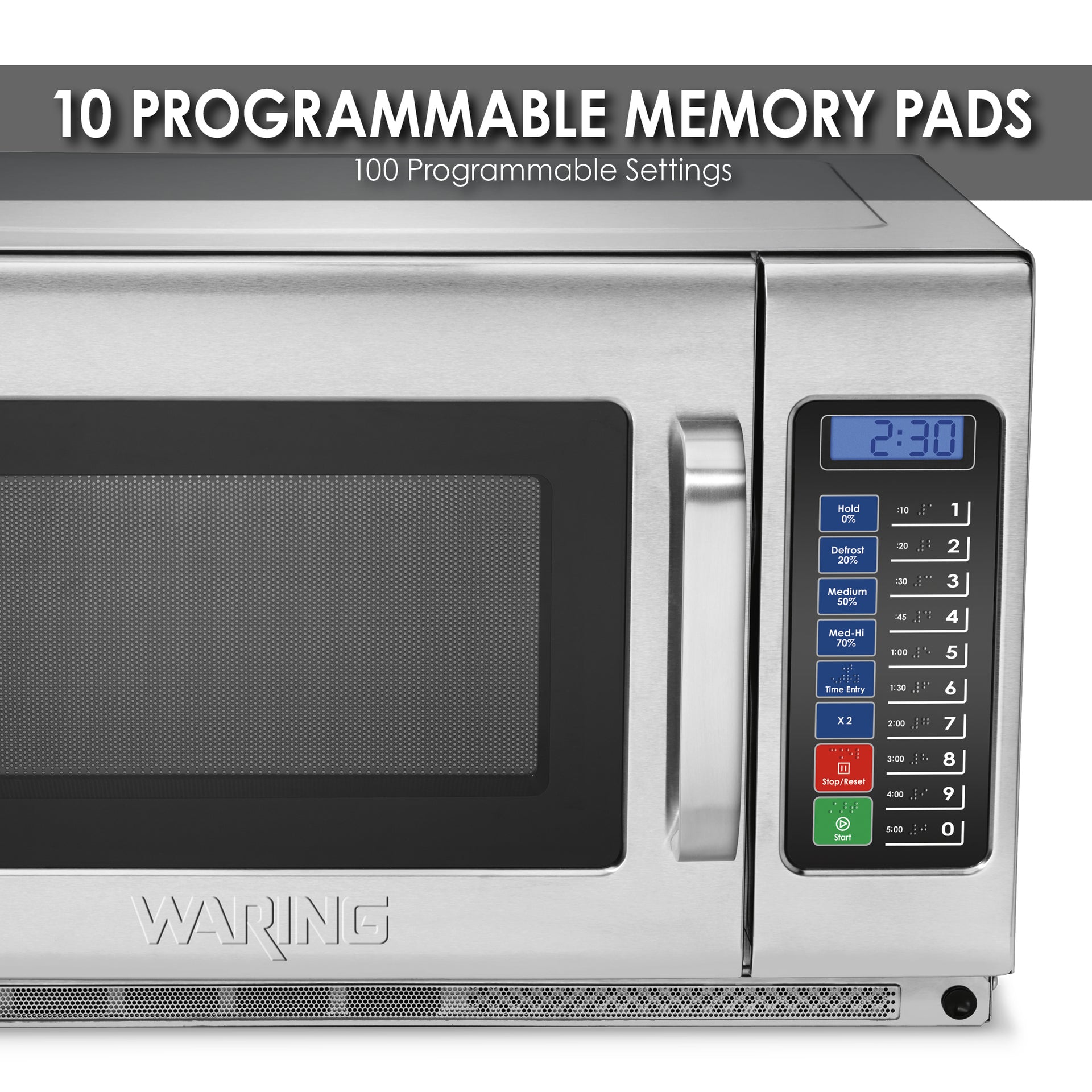 Put your favorite recipes on speed dial with the Waring® WM0120 Heavy-Duty 1.2 Cubic Foot Microwave Oven. This sturdy, stainless steel microwave oven has push-button controls and 1800 watts of power. Five built-in power levels and 100 programmable settings let you create up to 10 different combinations of time and power settings. Efficiently cook veggies, soups, prepackaged meals and more!