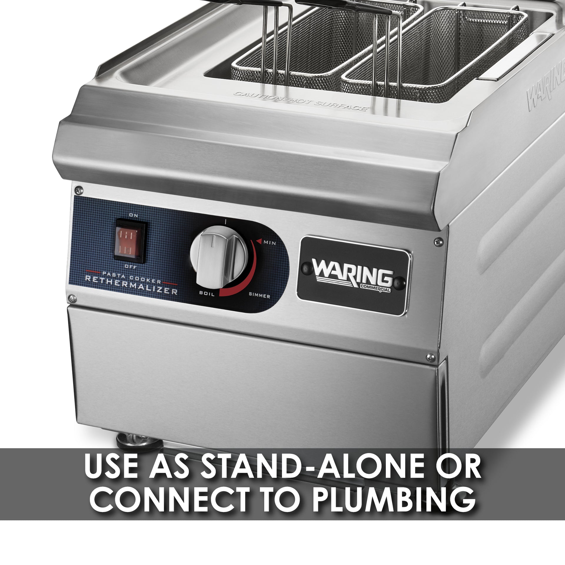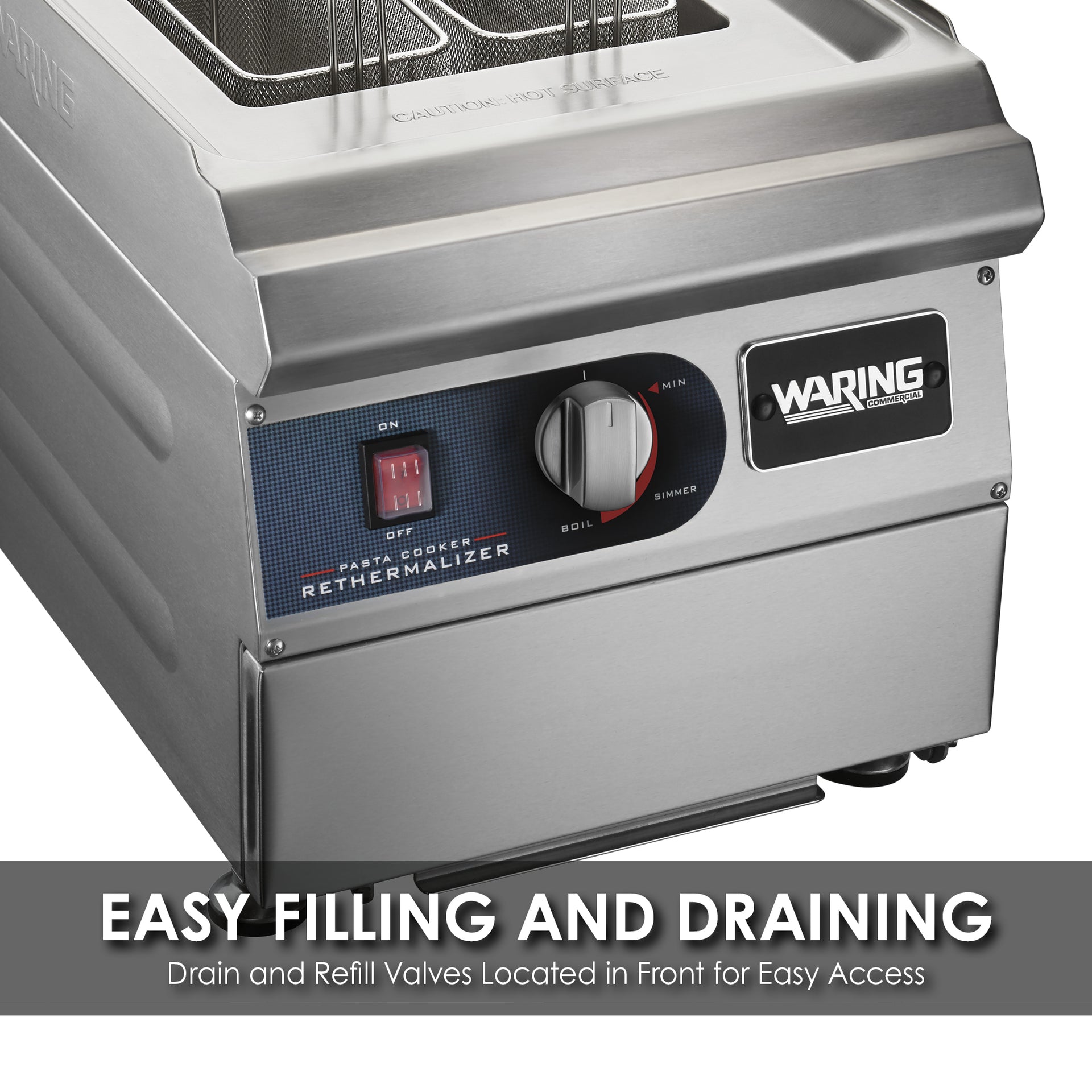 Cooking perfect pasta is easy with the Waring® Pasta Cooker/Rethermalizer. Make individual orders from al dente to soft using the 4 small, round baskets, or prepare batches by the pound with the large rectangular baskets. The fill and drain valves are easily accessible inside a panel on the front of the cooker, and there's an overflow water outlet on the back.