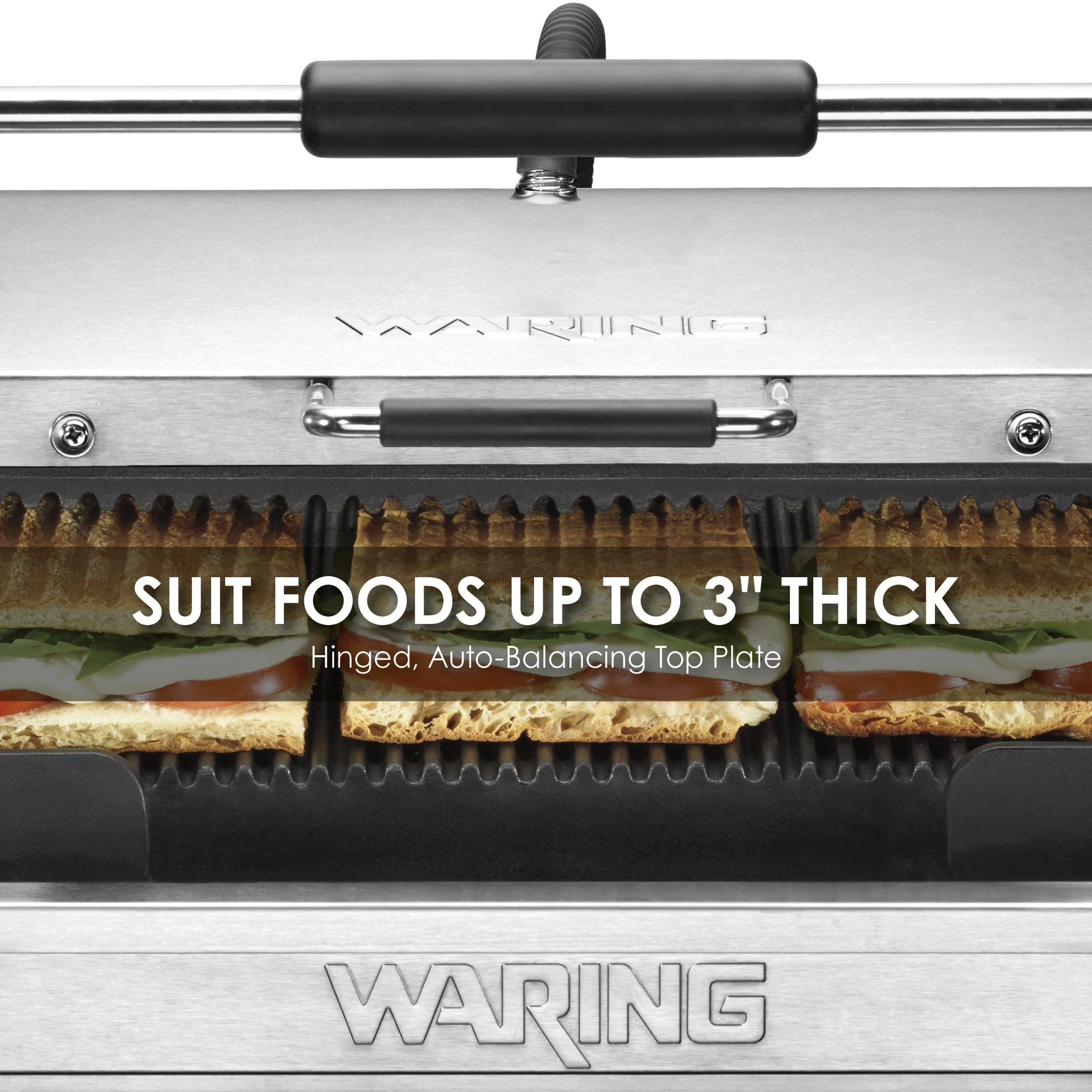- Hinged, auto-balancing top plate suits foods up to 3" thick