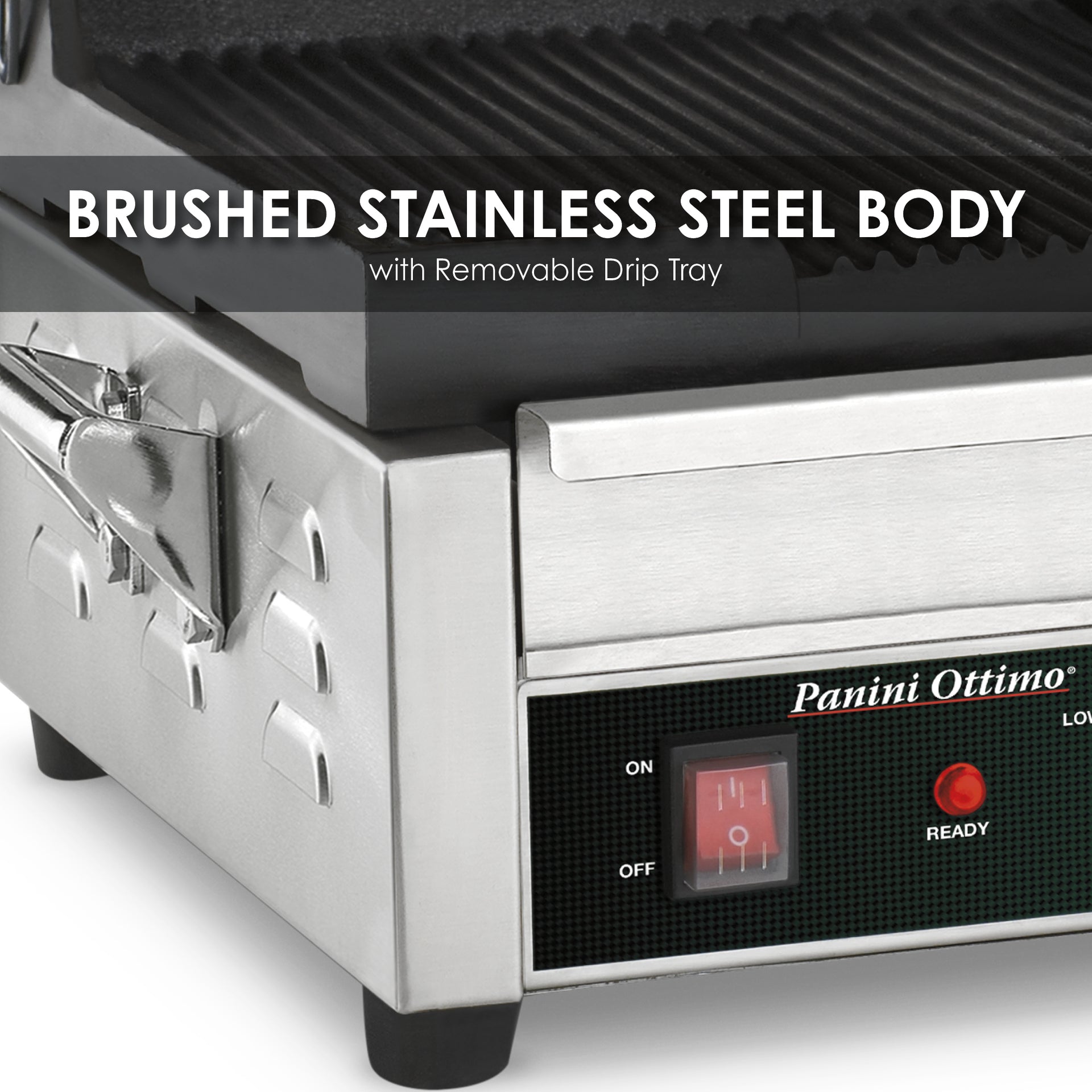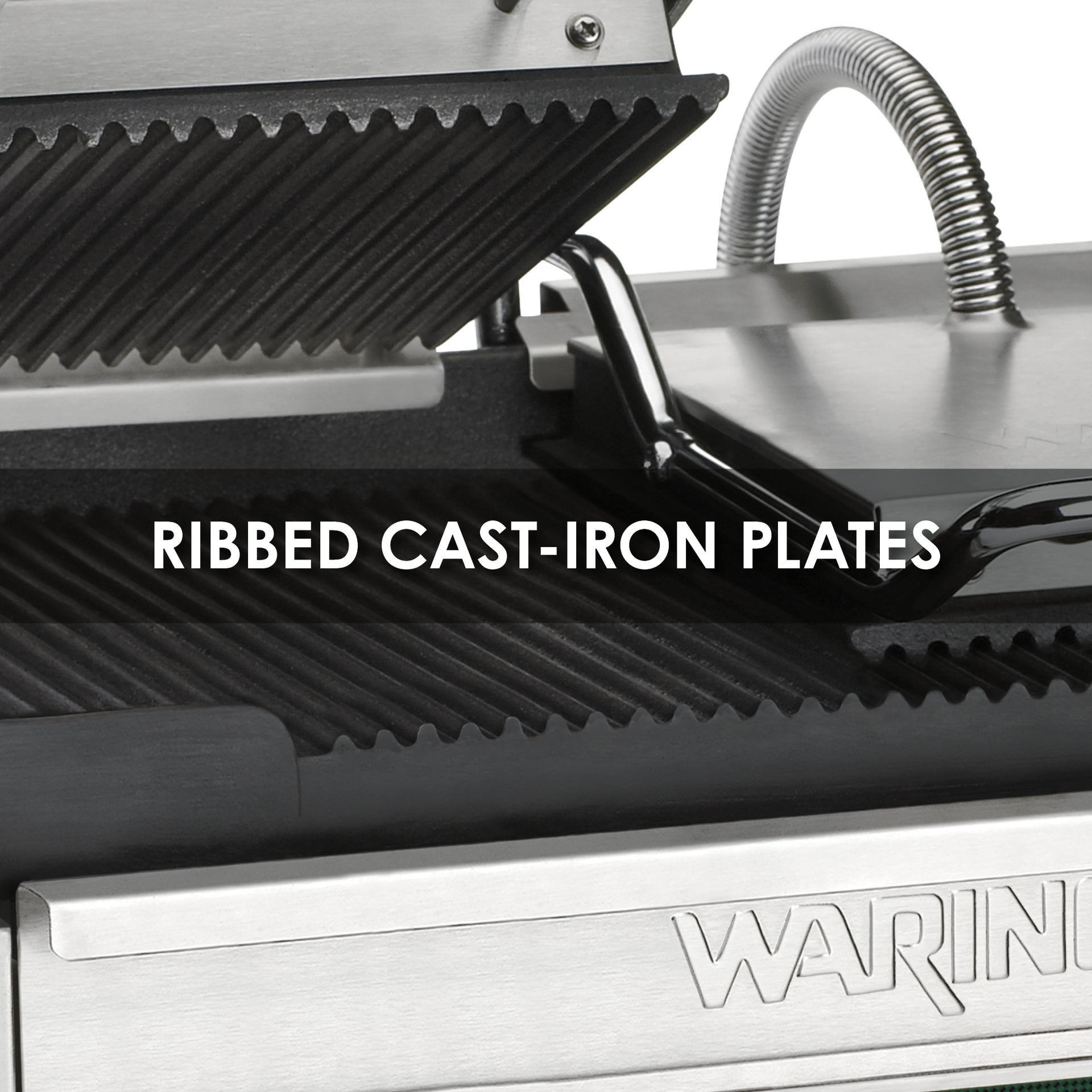 Make perfectly grilled panini sandwiches and more with the 240V Waring® WPG300 Double Italian-Style Panini Supremo® Grill. Grooved cast-iron plates heat evenly and quickly cook sandwiches, burgers, chicken, and vegetables up to 3" thick. Its brushed stainless steel body and removable drip tray are easy to clean. Includes dual POWER and READY indicator lights.