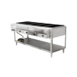 Featuring powerful heating and an innovative design, the Servewell hot-food table by Vollrath adds value to any buffet or serving area. The table and legs are made of strong stainless steel, while the wells are constructed of self-insulating thermoset fiber-reinforced resin to offer maximum energy efficiency. The dome heating elements use up to 25 percent less energy by concentrating that energy in the wells, while the capillary tube thermostat supplies power only when itʼs needed to reduce operational costs. Thermostatic controls ensure accurate heating and adjust automatically for water temperature and food volume changes to reduce food waste. A low-water indicator light keeps you informed, and the wide no-drip lips on the wells keep the surface dry. Built-in features like a cutting board, a side shelf, control guards and a long bottom-mounted power cord ensure a convenient, safe and streamlined user experience.