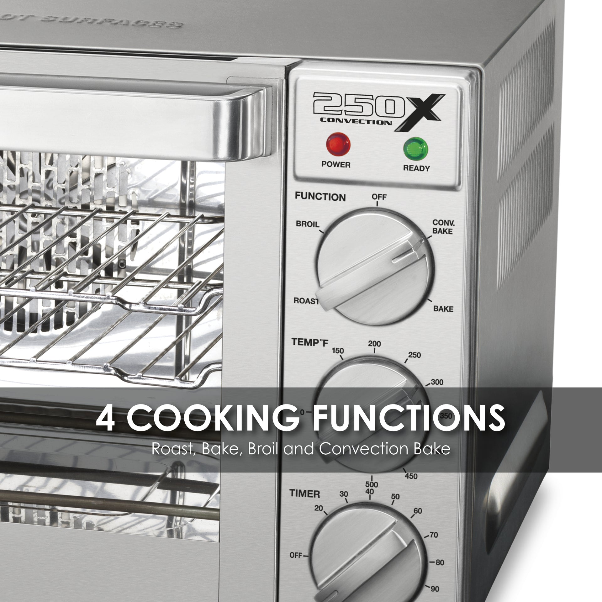 Get four cooking methods in one with the Waring® WCO250X Quarter-Size Convection Oven. Convection bake, roast, bake and broil all in one place. Heavy-duty, brushed stainless steel construction easily handles roasts, pizzas, pies, breads and more. Its double-pane, tempered glass door gives good visibility. This heavy-duty convection oven weathers the most challenging cooking environments and is still easy to clean.