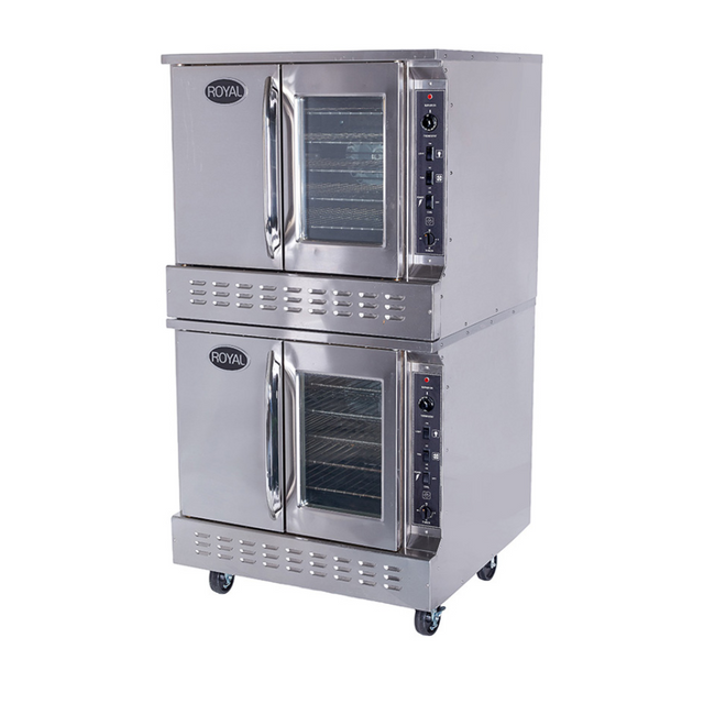Convection Oven, gas, double-deck, standard depth, thermostatic controls, temp range 150°F - 500°F, electronic ignition, 2-speed fan, (4) burners, (2) interior lights, (5) chrome plated racks with (11) positions, pressure regulator included, porcelain interior, dual stainless steel doors with glass viewing window on right, stainless steel front, sides & top, legs, 1/2 HP, 140,000 BTU, cCSAus, CSA-Sanitation, Made in USA, ENERGY STAR®