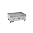 Introducing the Sapphire Countertop Gas Griddle, designed for compact kitchens. With a single U-shaped burner and a durable 5/8" thick hot rolled steel plate, it ensures even cooking. Equipped with a stainless steel pilot, grease collector, and splash guard for safety and cleanliness. Manual controls and brass valve offer precise temperature regulation. Featuring sturdy stainless steel front, galvanized sides, and adjustable legs for stability. Producing 30,000 BTU, it's powerful and reliable. Certified by cETLus and ETL for safety and sanitation compliance.