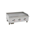 Introducing the Sapphire Countertop Gas Griddle, featuring four U-shaped burners and a 3/4" thick hot rolled steel plate for even heat distribution. With a standby stainless steel pilot, grease collector pan, and splash guard, it ensures safety and cleanliness. Manual controls and brass control valve allow precise temperature adjustment. With adjustable legs and rear gas connection, it offers flexibility and convenience. Producing 120,000 BTU, it's ideal for high-volume cooking. Certified by cETLus and ETL for sanitation compliance, it's perfect for commercial kitchens.