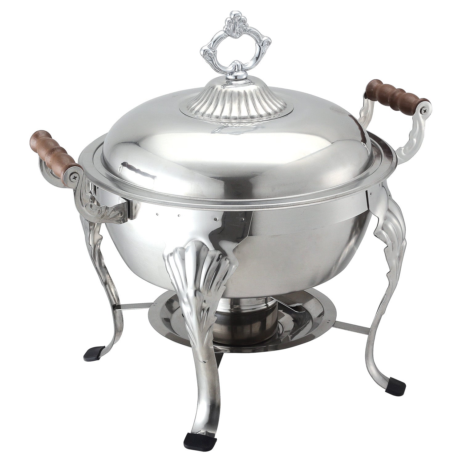 Welsh Chafing Dish, 6 qt., round, decorative lid handle, wood colored side handles, beveled legs with non-skid caps, includes: (1) cover, (1) water pan, (1) food pan & (2) fuel holders, stainless steel (Qty Break = 1 set)