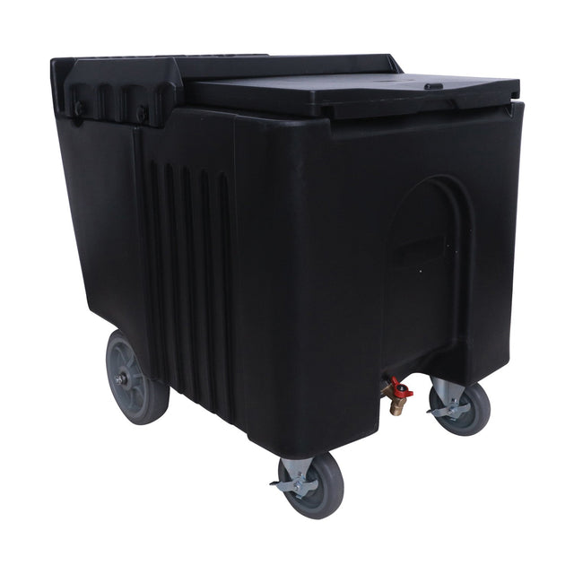 Ice Caddy, mobile, 31-1/2"L x 23"W x 29-3/8"H, 126 lb. capacity, up to 4 hour cold retention, sliding cover, polyurethane foam insulation, built-in faucet & water tank, for indoor/outdoor use, no assembly required, (4) non-marking casters (2) with brakes, black, NSF (ships by freight only, UPS small package is not available) (Qty Break = 1 set)