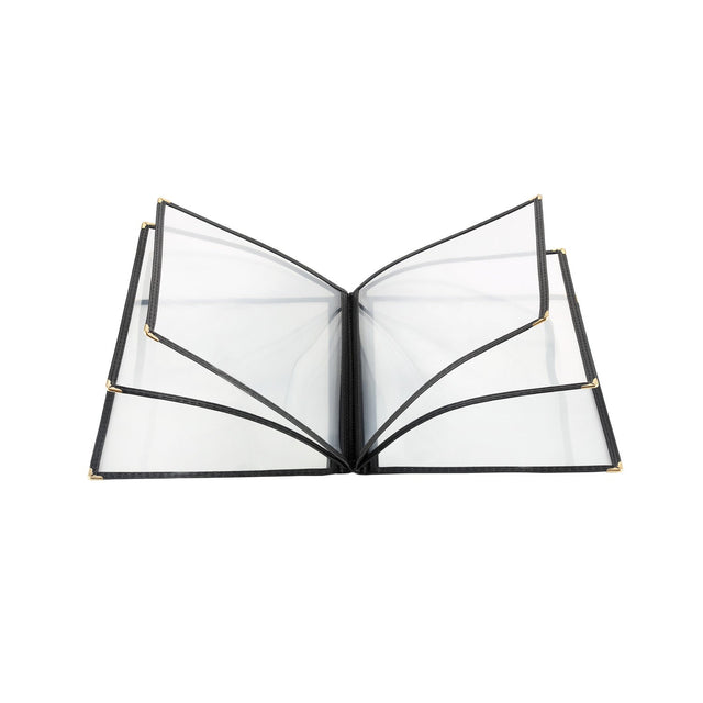 Menu Cover, 4-pocket, 8-1/2" x 11", Letter Size insert, clear double-sided view, with brass corners, black trim (QTY break = 25 each)