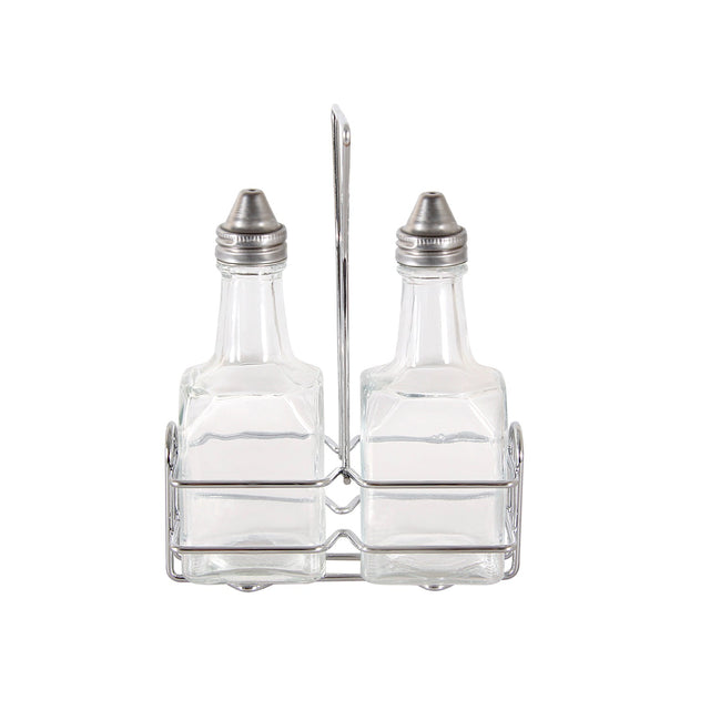 Oil/Vinegar Cruet Set, 6 oz., (2) lead free glass cruet with stainless steel pourer, (1) chrome rack(QTY break = 12 sets)