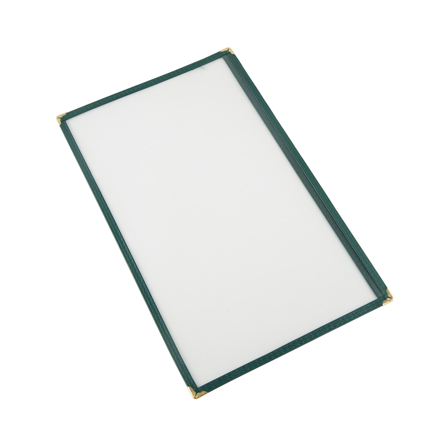 Menu Cover, 1-pocket, 8-1/2" x 14", Legal Size insert, clear double-sided view, with brass corners, green trim (QTY break = 25 each)