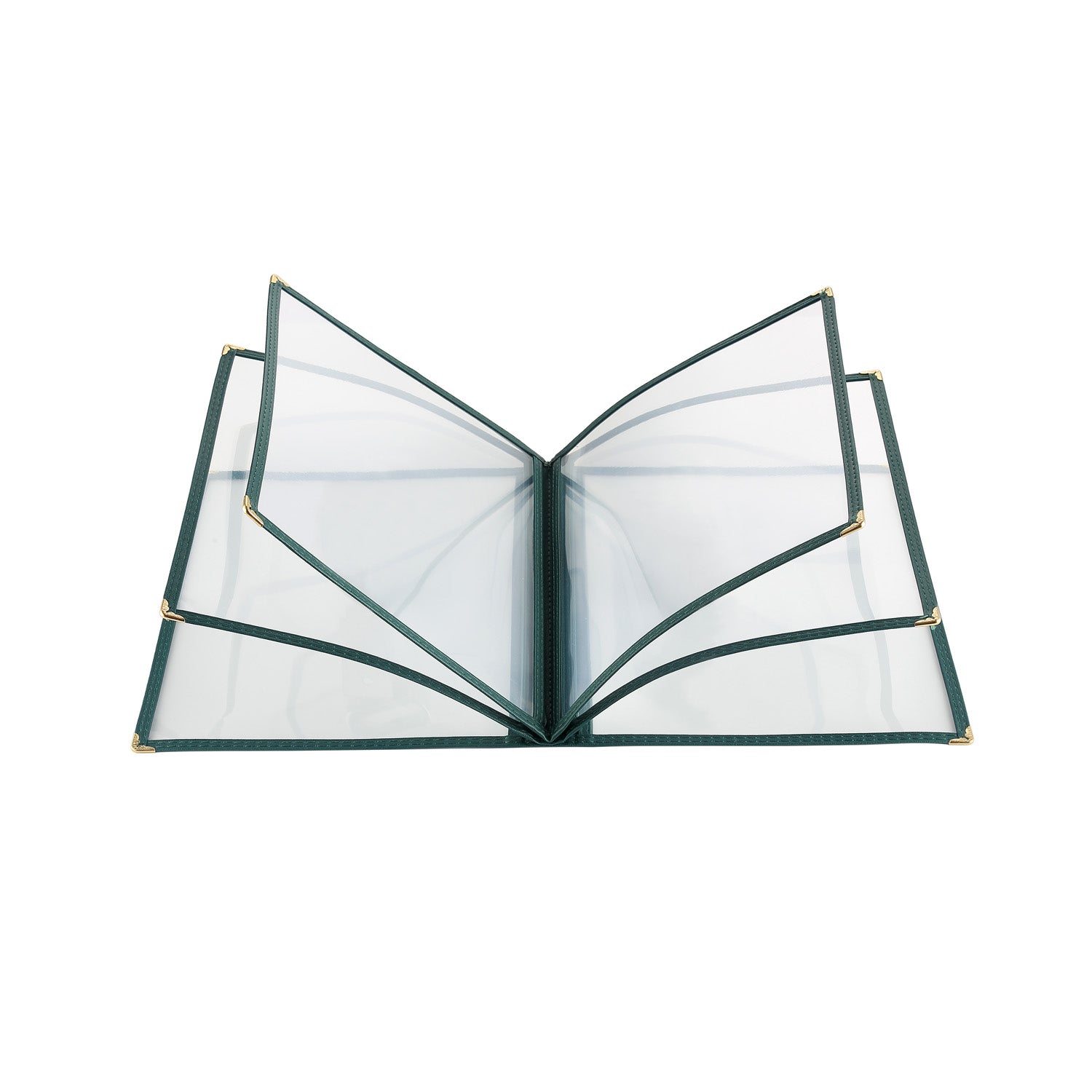 Menu Cover, 6-pocket, 8-1/2" x 11", Letter Size insert, clear double-sided view, with brass corners, green trim (QTY break = 25 each)