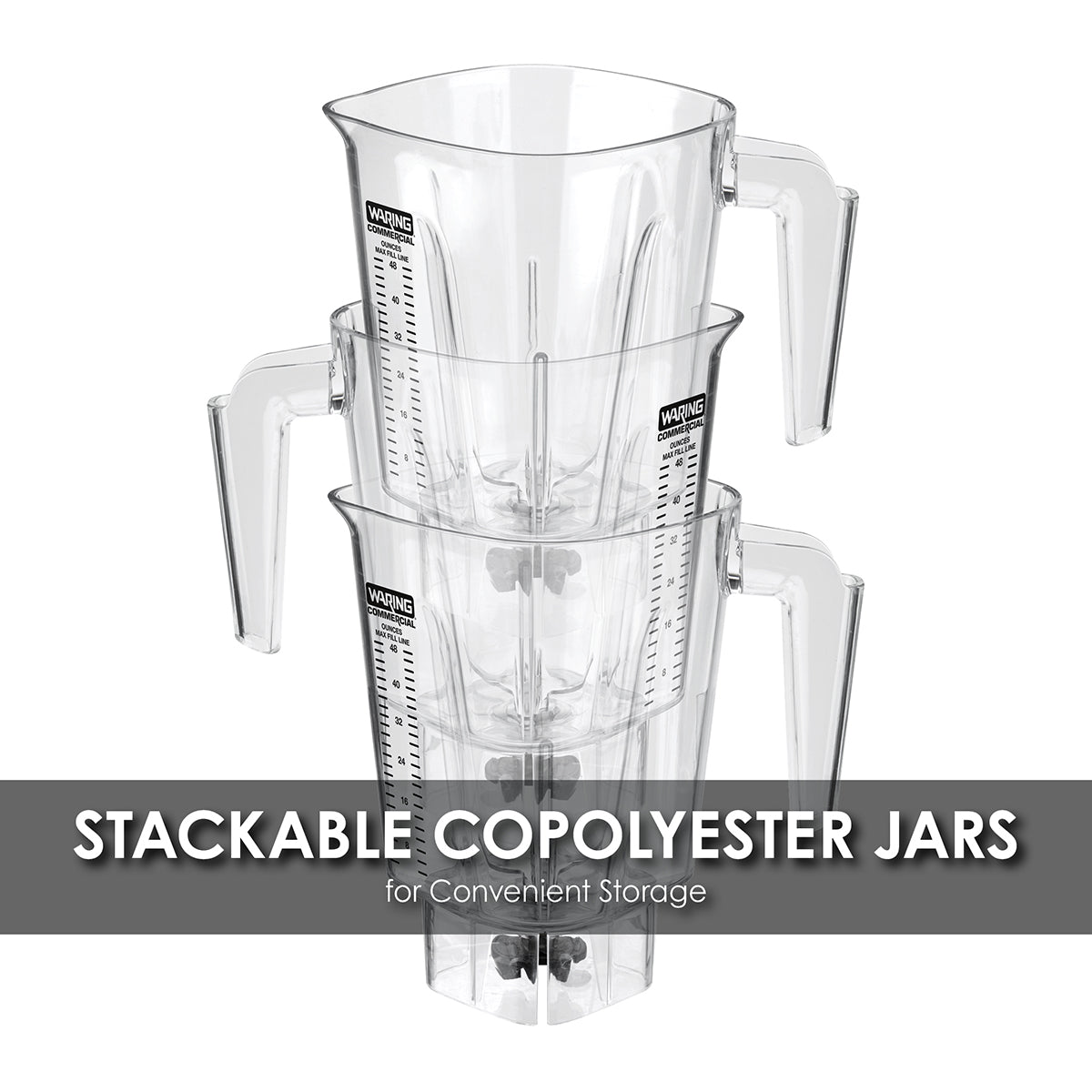 The Waring BB320 Blade Series 1 HP Blender has you covered when your bar is busiest. Make three 16 oz. margaritas in 12 seconds. Its 2-speed, powerful 1 HP motor and electronic touchpad controls feature ON/OFF, LOW, HIGH, PULSE and STOP. A removable, rubberized jar pad dampens sound and makes cleanup easy. Stackable 48 oz. copolyester jars make storage a snap.