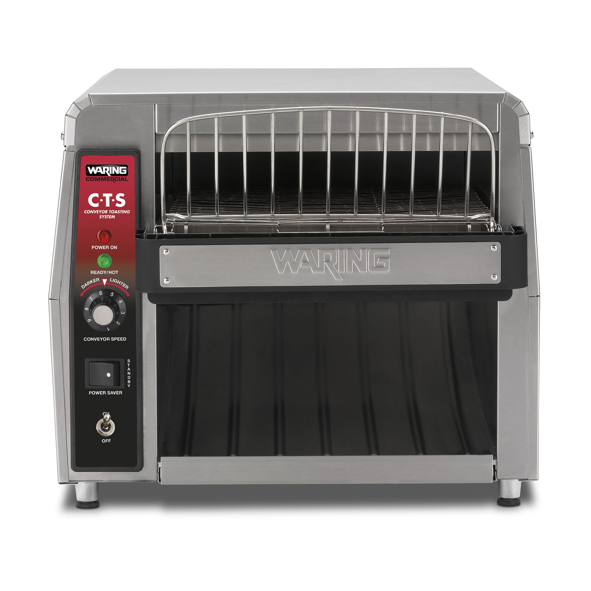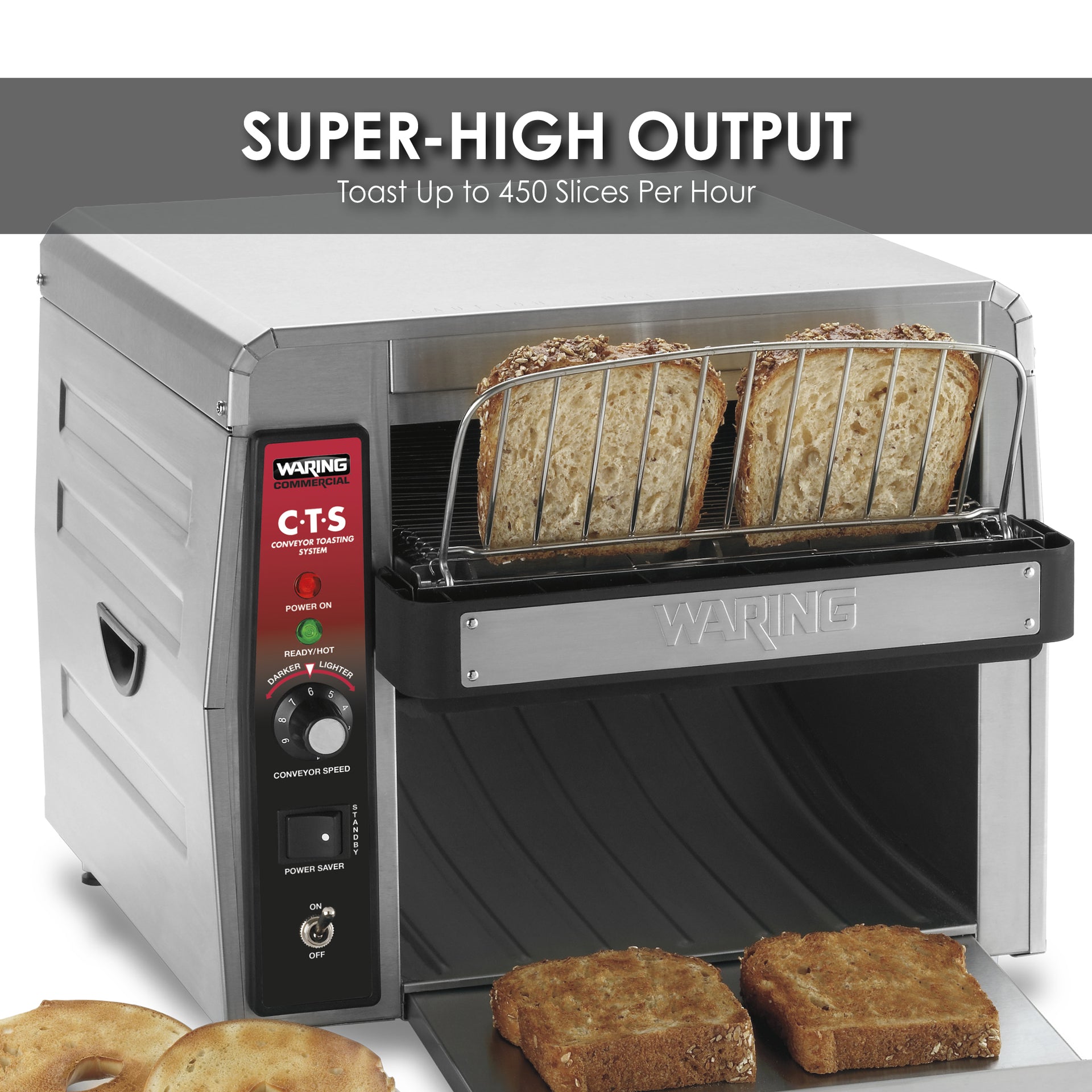 Effectiveness meets versatility with the Waring® CTS1000 Heavy-Duty Conveyor Toaster. This lightweight, portable unit is perfect for cafes, diners, breakfast bars, or any food service operation looking for a compact and handy solution. Toast up to 450 slices per hour of breads and bagels up to 2” thick. Super-high output makes it easy to keep up with the breakfast rush.• Heavy-duty, brushed stainless steel construction