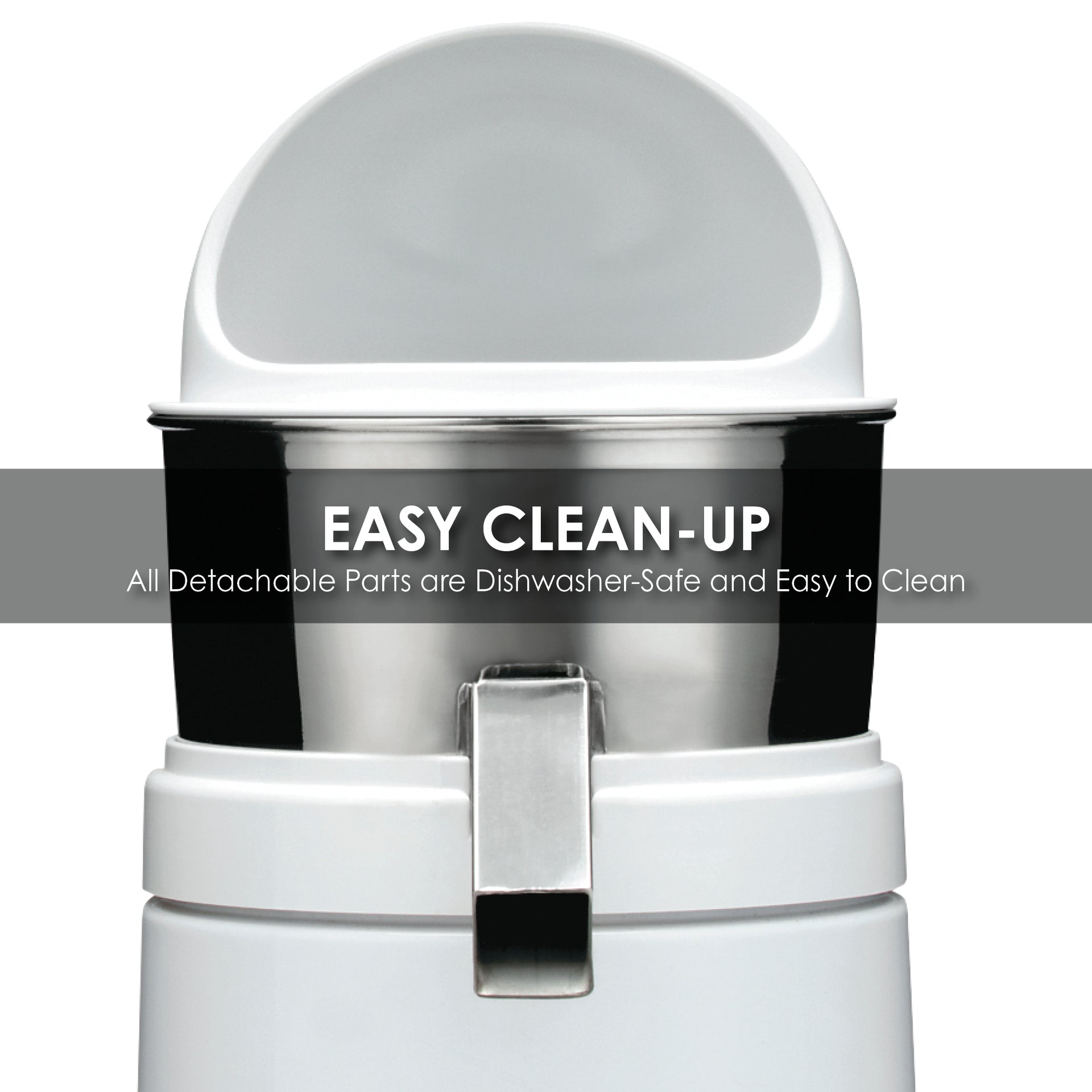 - Stainless steel juice collector drains juice through a large spout for high-volume production