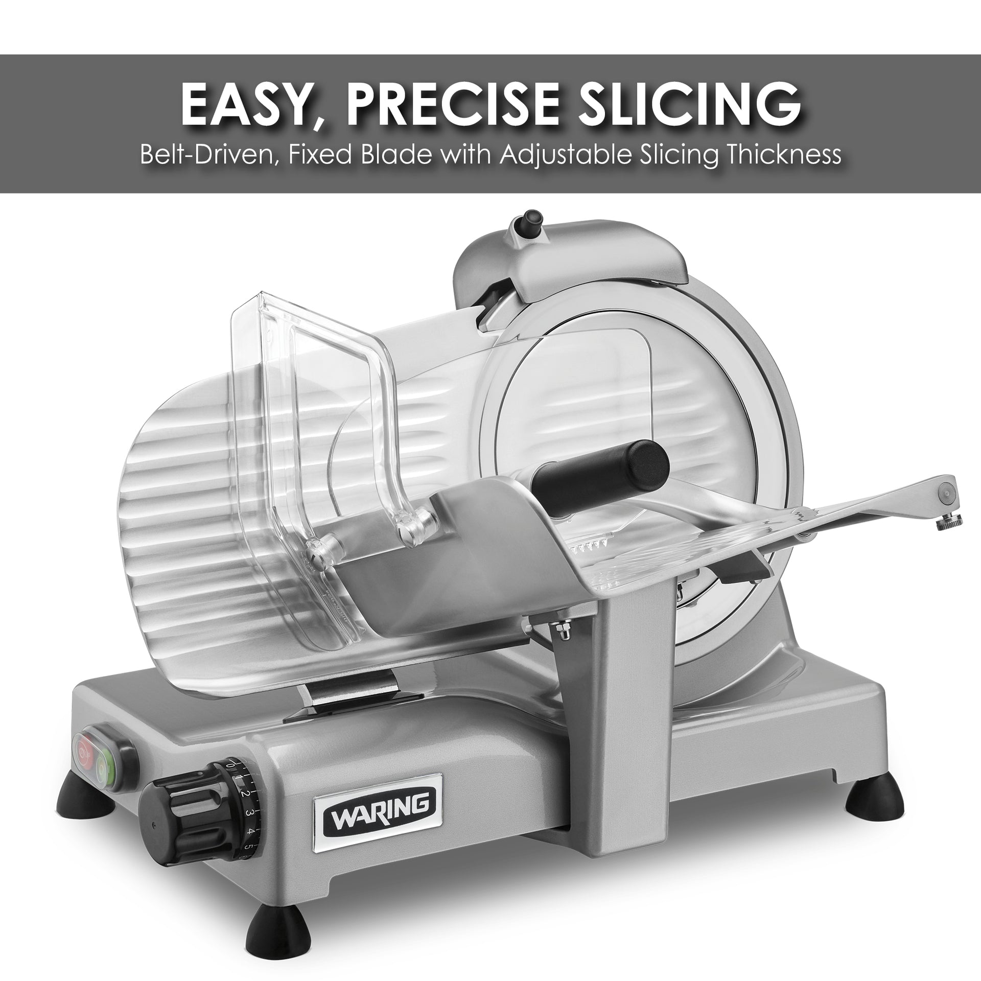 - Belt-driven, with fixed blade for slicing ease and precision
