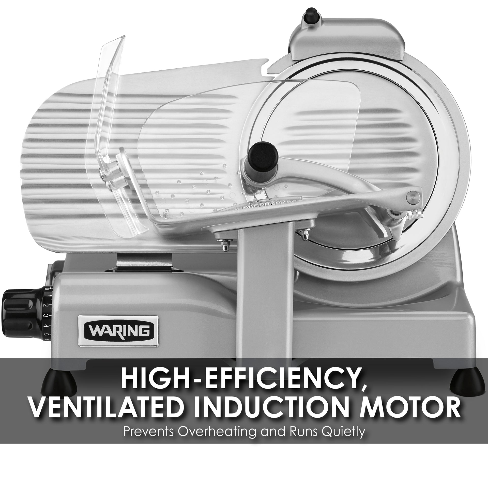 A commercially rated ¾ peak HP* motor is the power behind Waring’s WCS220SV medium-duty food slicer. Made in Italy, with an 8.5" tempered, hard chrome blade that retains its sharp cutting edge and adjusts thickness from 0 to .59 in. to perform a wide range of slicing tasks. The sturdy base and tilt-out carriage design with removable blade make operation and cleanup exceptionally easy.