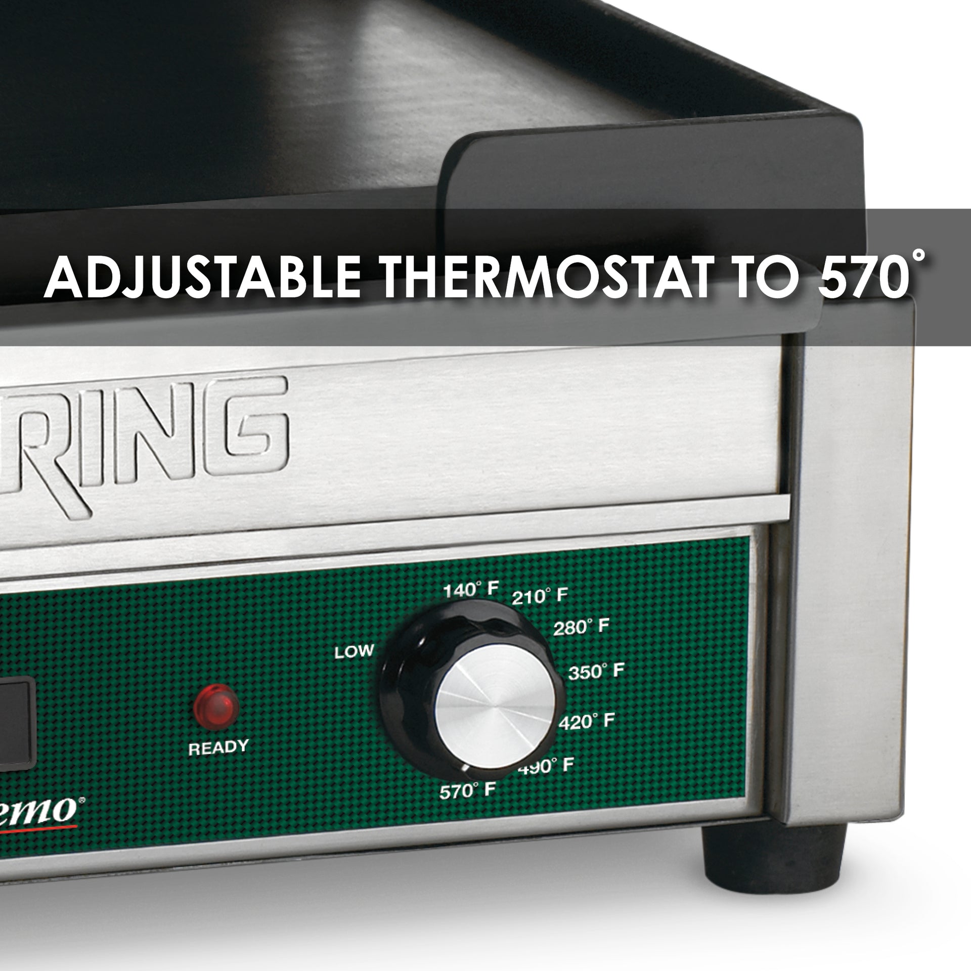 - Adjustable thermostat to 570° and power ON and READY indicator lights, and timer.