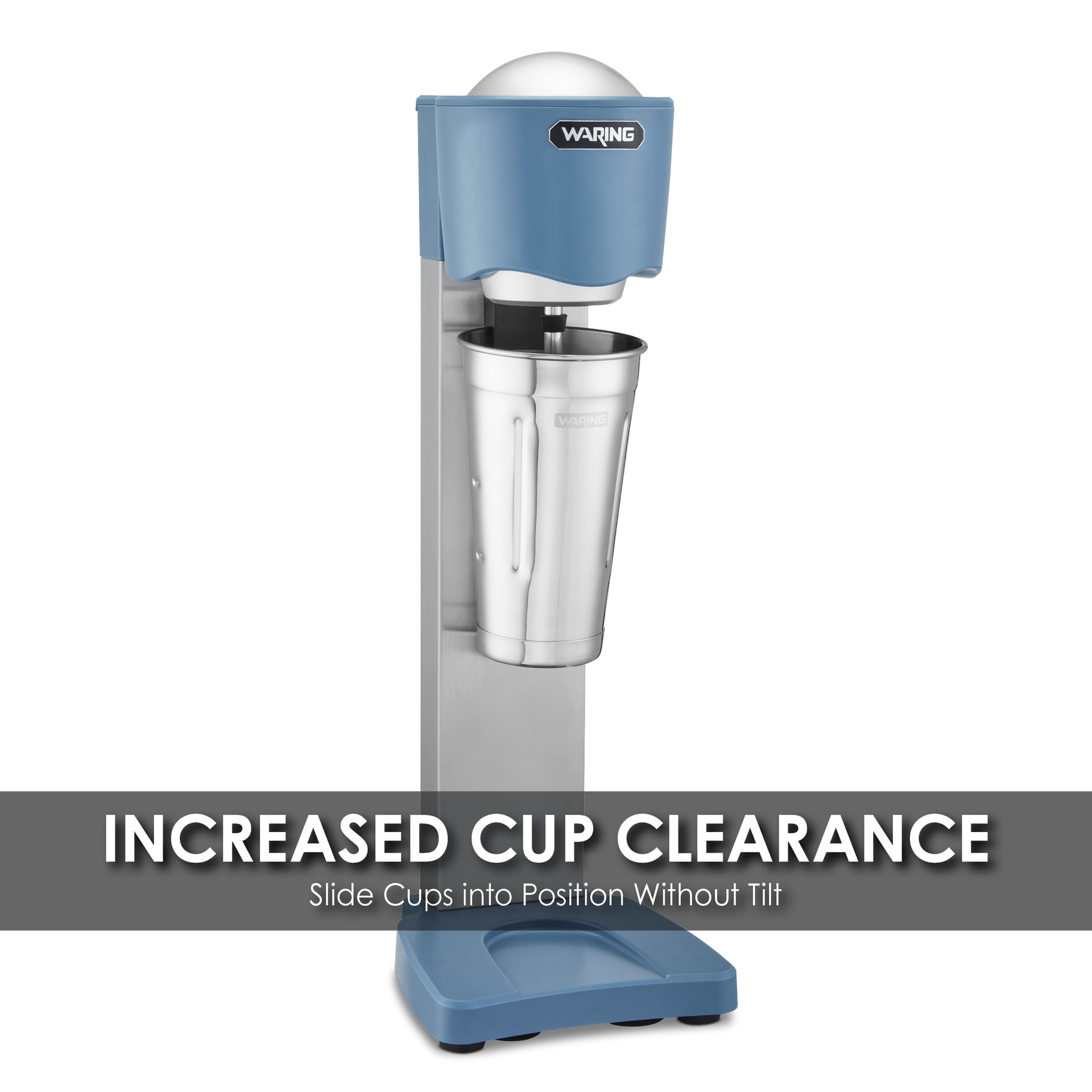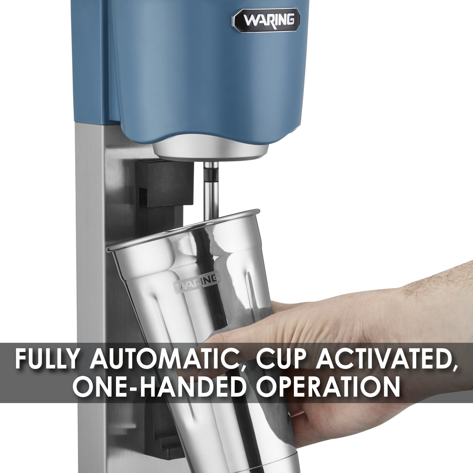 The hands-free, cup-activated Waring® WDM20 Single-Spindle Drink Mixer turns hard or soft ice cream into classic malts and milkshakes with a 1 peak HP, high-performance motor. Slide the stainless steel malt cup straight into position and toggle the 2-speed switch to make fast, frozen drinks your customers will love. Designed for front-of-house use wherever delicious malts and milkshakes are in demand.