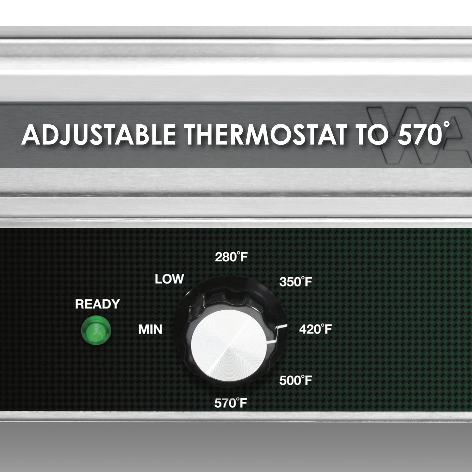 Serve up breakfast and short-order items fast and easy with the 240V Waring® WGR240X 24" Electric Countertop Griddle. A large 24" x 16" grilling surface offers even heat distribution—perfect for larger items such as quesadillas, omelets and pancakes. Protect yourself from grease and spills with extra-tall splash guards and an oversized, fully removable grease tray.