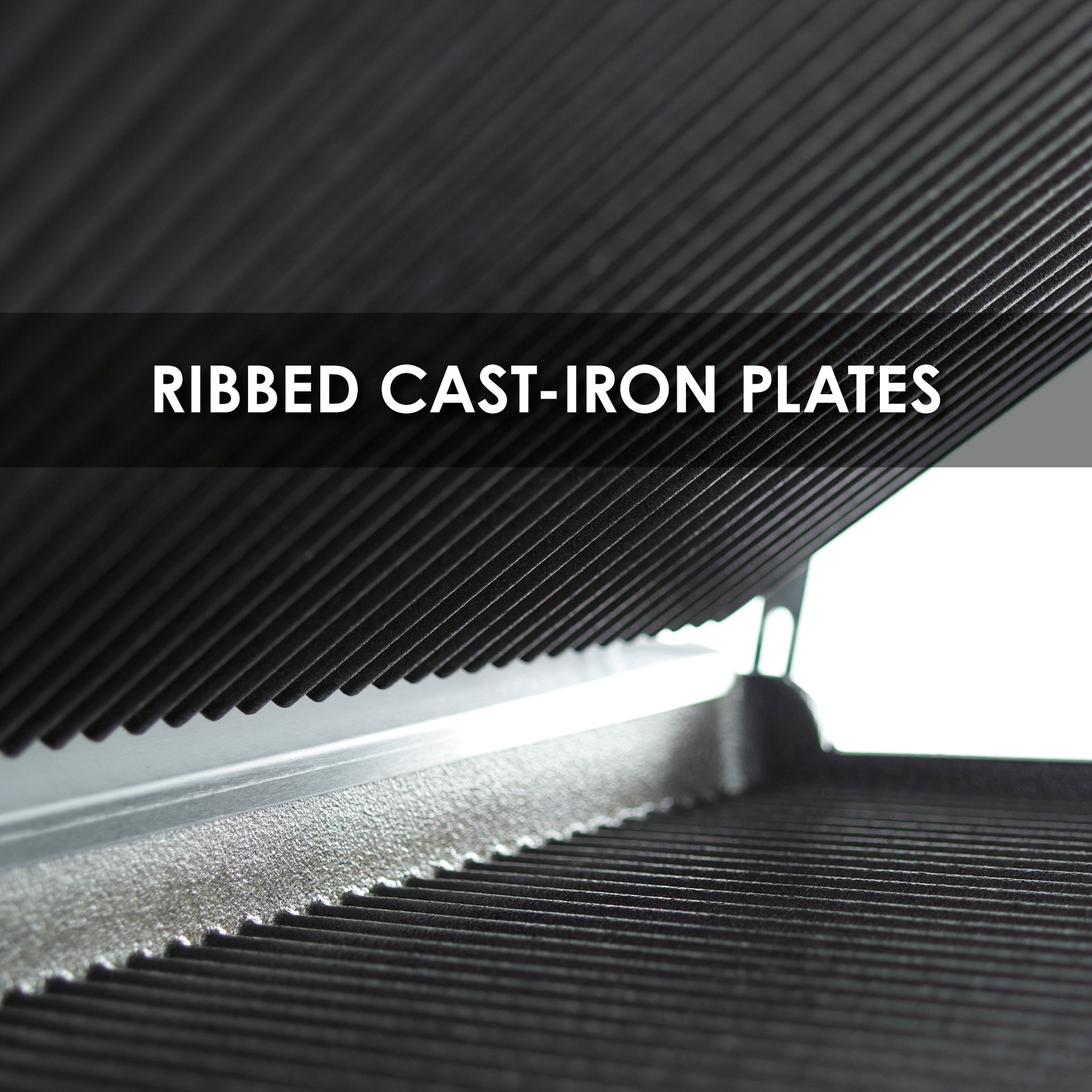 - 14.5" x 11" cooking surface and ribbed cast-iron plates