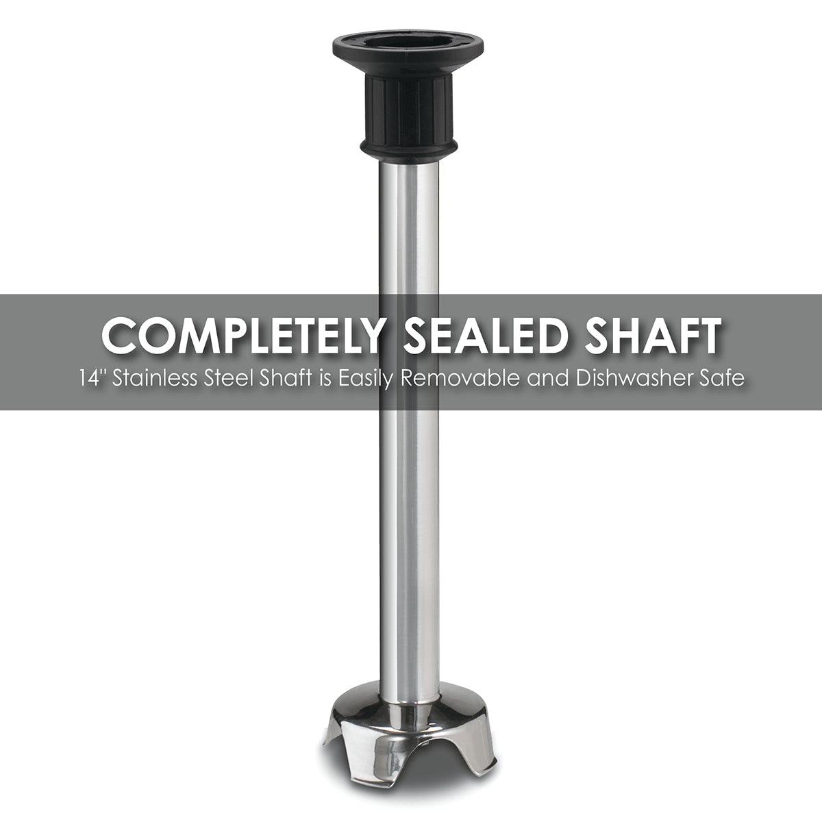 The Waring® WSB55 Big Stik® 14” Immersion Blender cranks out the smoothest sauces, dressings, marinades and soups in seconds. Use with accessory bowl clamp WSBBC for hands-free operation—works great in a high-volume kitchen. The completely sealed 14-inch stainless steel shaft is easily removable and dishwasher safe. Mix, purée and emulsify up to 15 gallons.