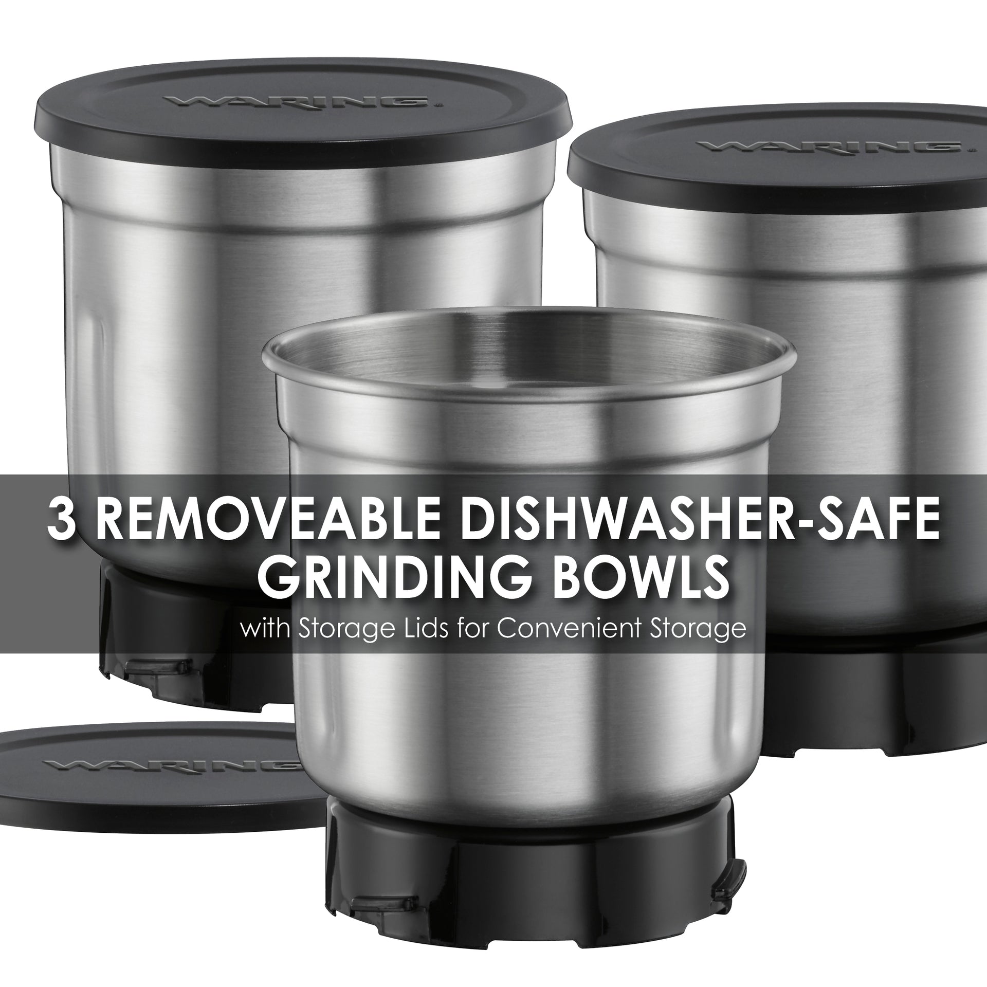 - Includes 3 dishwasher-safe, stainless steel grinding bowls and lids