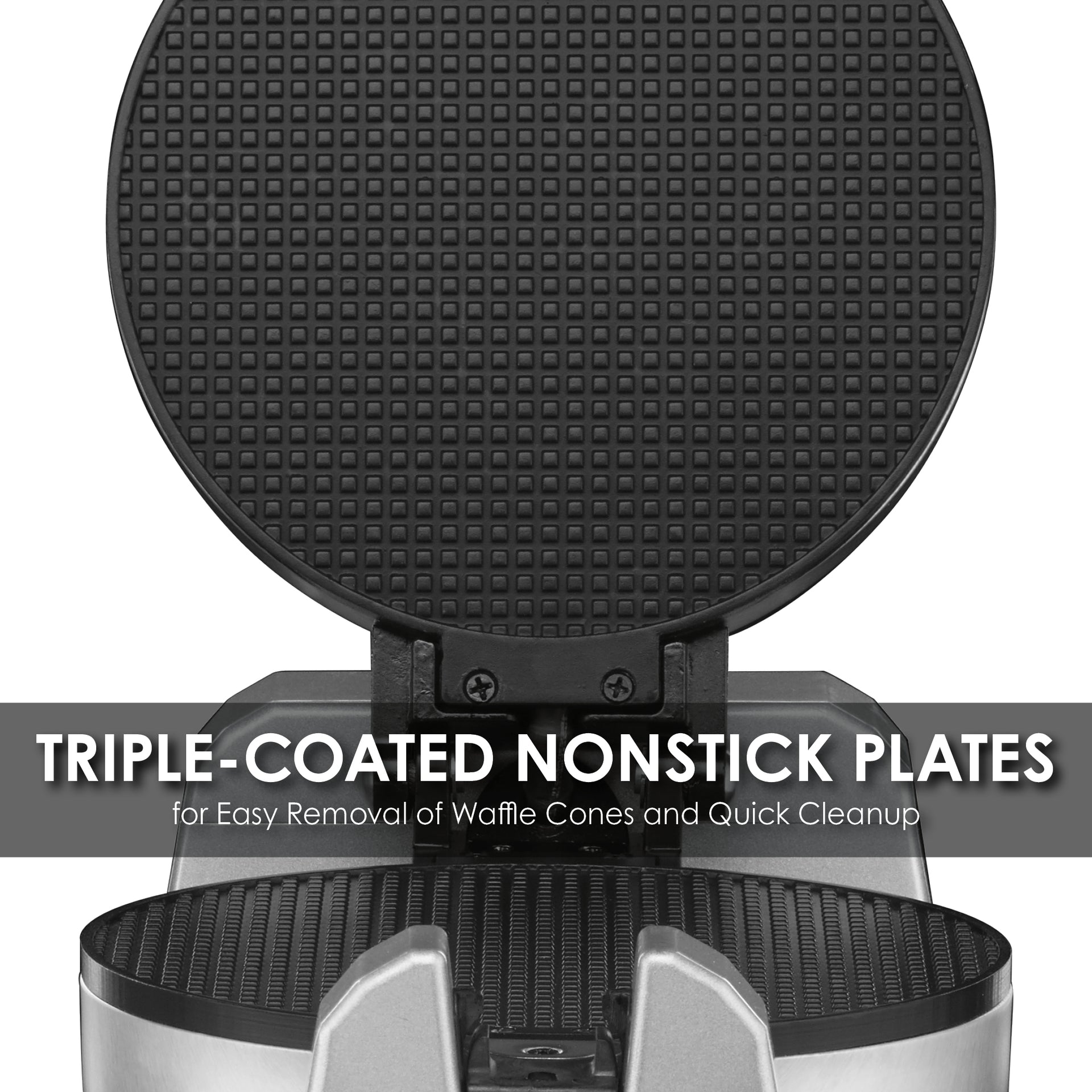 - Triple-coated, nonstick plates allow easy removal of waffle cones and quick cleanup