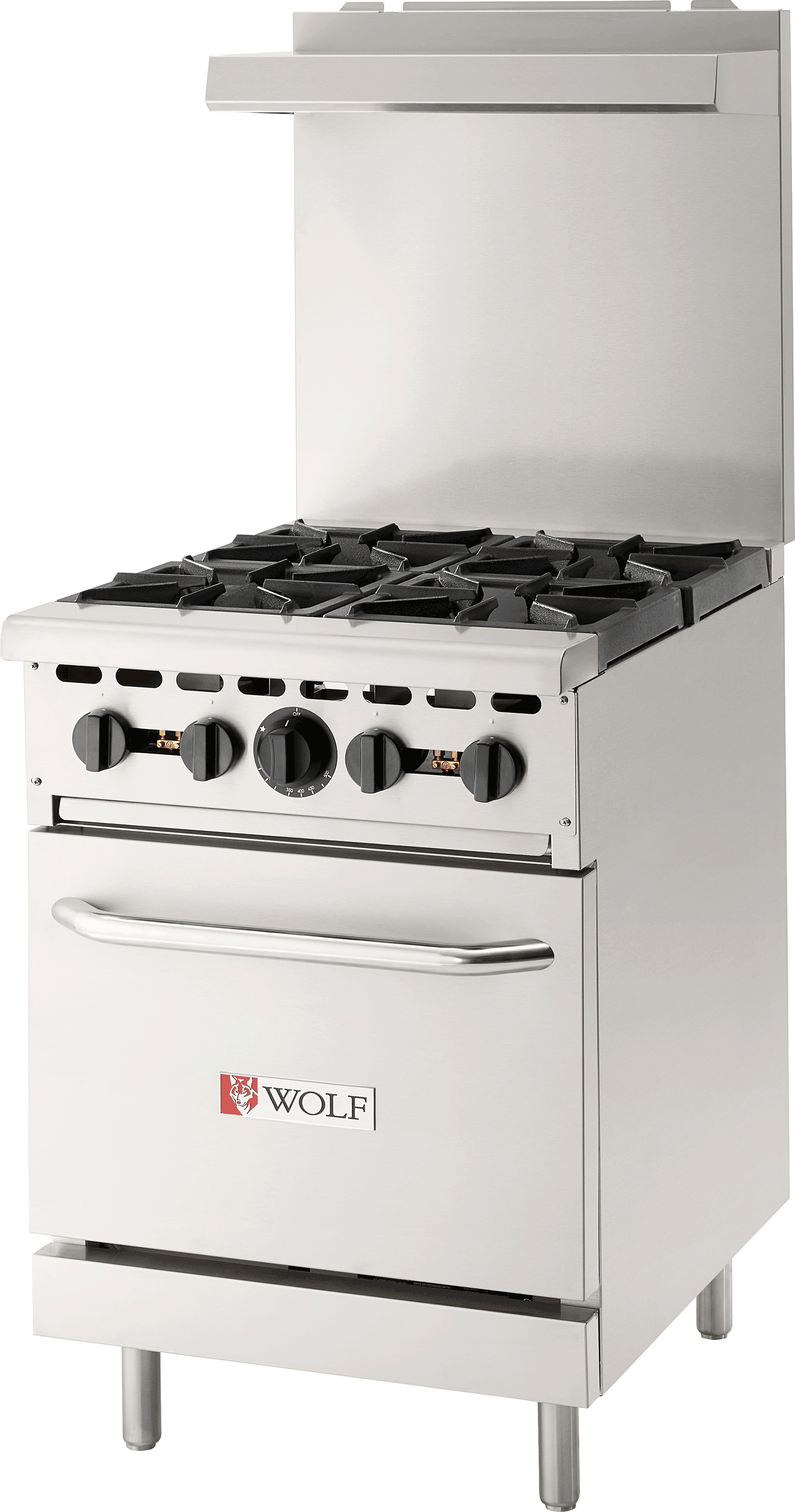 24" wide WX series light-duty range, Wolf Model No. WX24-4B. Stainless steel front, sides, backriser, high shelf and bullnose. Porcelain door liner and oven bottom. Four 28,000 BTU/hr. cast top burners with lift-off burner heads. 12" x 12" cast top grates with aeration bowls. Heavy duty top grates and burner heads. Compression spring door hinge system for durability. 30,000 BTU/hr. oven measures 20.6"W x 25.5"D x 13.7"H. Thermostat adjusts from 250° to 500°F. One oven rack with four rack positions. 3 ⁄4" rear gas connection and gas pressure regulator. Total input: 142,000 BTU/hr.